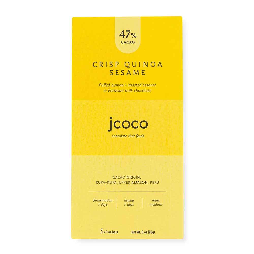 An unexpected blend of high cacao (47%) Peruvian milk chocolate with quinoa and toasted sesame will transform perceptions of the classic chocolate crisp. They use quinoa puffed under low heat, glaze it in blue agave to seal the texture, and add in toasted sesame seeds, creating a milk chocolate experience that leans more savory than sweet. The cacao origin is Rupa-Rupa, Upper Amazon region of Peru. The beans are fermented 7 days, dried 7 days with a medium roast.