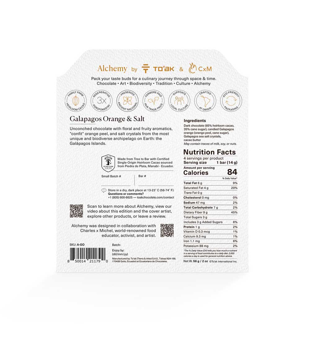 INGREDIENTS: Dark chocolate (65% heirloom cacao, 35% cane sugar), candied Galapagos orange (orange peel, cane sugar), Galapagos sea salt crystals, cacao butter