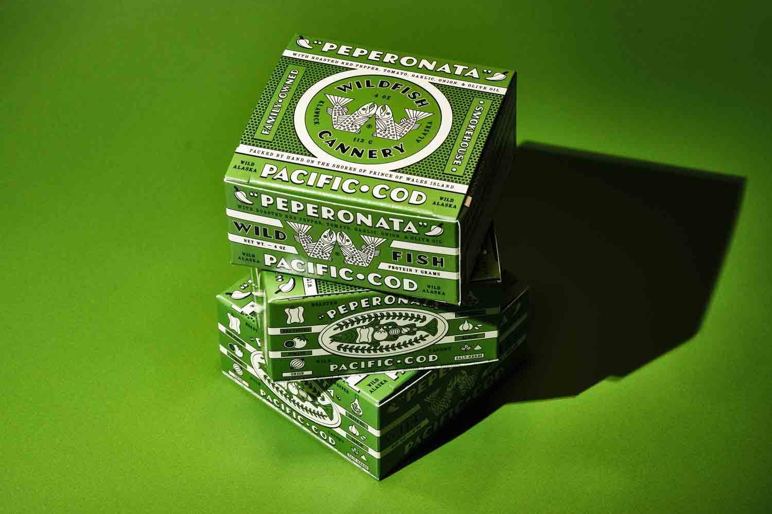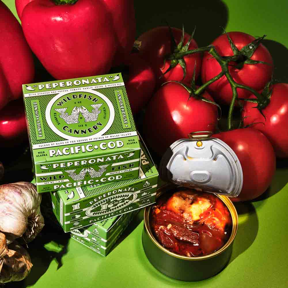 Delicate Pacific Cod cooked to perfection with a rich, aromatic sauce composed of roasted red peppers, tomato, onions, garlic, extra virgin olive oil, and anchovies. Yep, Wildfish put tinned fish in your tinned fish.