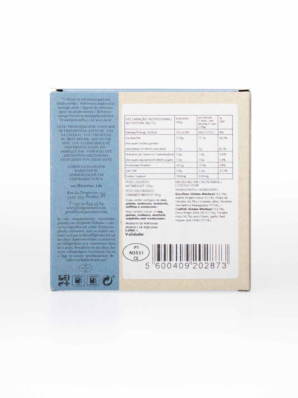 Despite its origin, cod is an integral part of Portuguese identity, occupying an important place in national gastronomic tradition. This stew is designed to deliver a Portuguese tradition in a tin. It takes simple ingredients (tomato, onion, garlic) in the right ratios to provide the traditional flavors of Caldeirada we have come to know and love.