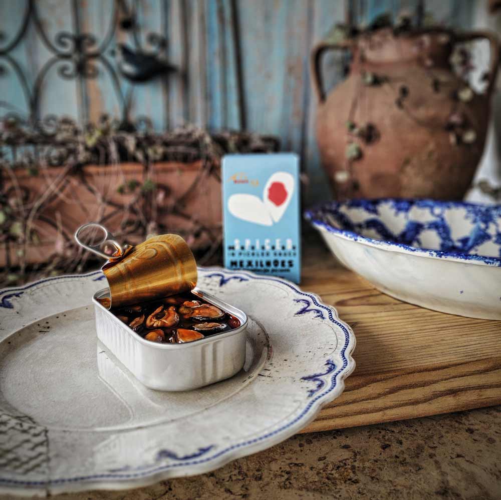 Made in Galicia in the old way, the sauce is a spicy twist on a classic escabeche, a medley of oil, vinegar, and pepper that predates modern Spain and harkens to a time when southern Iberia was part of the Islamic Empire called Al-Andalus (which became the name Andalusia). It is bursting with tradition and flavor. We enjoy them tossed with fusilli and green olives or toothpicking them straight from the tin.