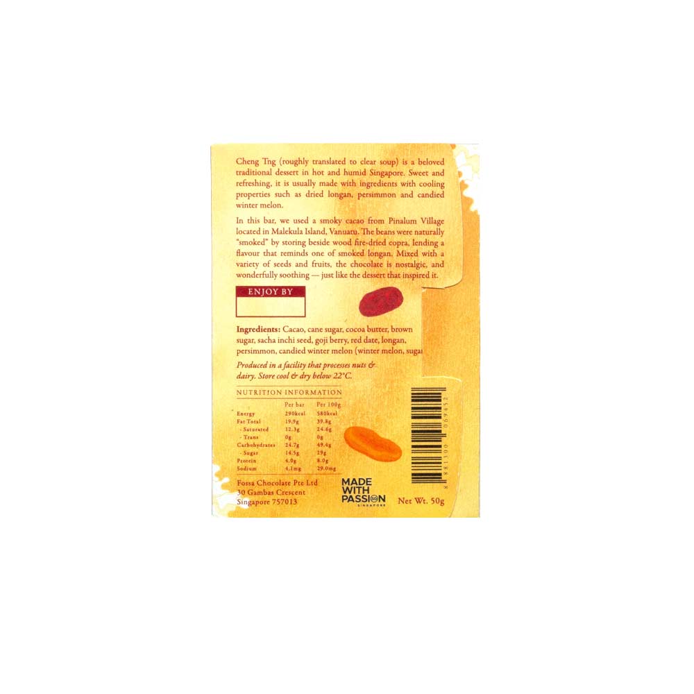 In this bar, Fossa used a smoky cacao from Pinalum Village located in Malekula Island, Vanuatu. The beans were naturally “smoked” by storing beside wood fire-dried copra, lending a flavour that reminds one of smoked longan. Mixed with a variety of seeds and fruits, the chocolate is nostalgic, and wonderfully soothing — just like the dessert that inspired it.