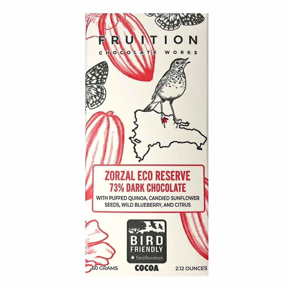 73% Dark Chocolate with puffed quinoa, candied sunflower seeds, wild blueberries, and citrus. This special new bar is crafted with Smithsonian certified Bird Friendly Cocoa from Zorzal Cacao in the Dominican Republic.