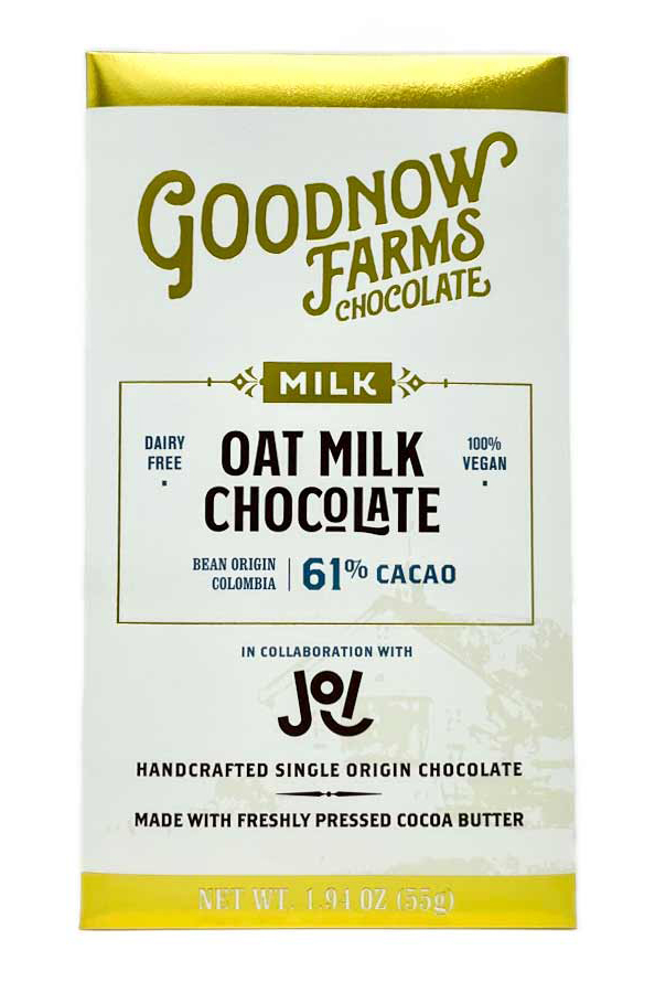 To craft this creamy, dairy-free bar, Goodnow uses their fine flavor single origin Boyaca cacao from Colombia and add just the right amount of oat milk from JOI. All of JOI’s organic oats are sourced from farmers in the Midwest and Canada, and no glyphosate is used during growth or harvest.