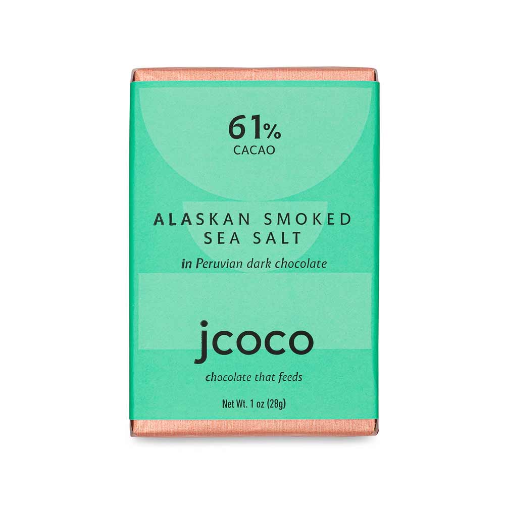 Sometimes an idea gets sent Jcoco’s way and they can’t help but explore it. So when a letter came across their CEO’s desk suggesting they try salt from Alaska Pure Salt Company in their smooth dark chocolate, they ran with it. Alaskan Smoked Sea Salt in 61% Peruvian dark chocolate. Made by smoking Alaska pure salt flakes over burning Alder wood, this unique ingredient lends a complex yet balanced flavor to their smooth dark chocolate, making for a bite that is both decadent and delicious. The cacao origin is Rupa-Rupa, Upper Amazon region of Peru. The beans are fermented 7 days, dried 7 days with a medium roast.