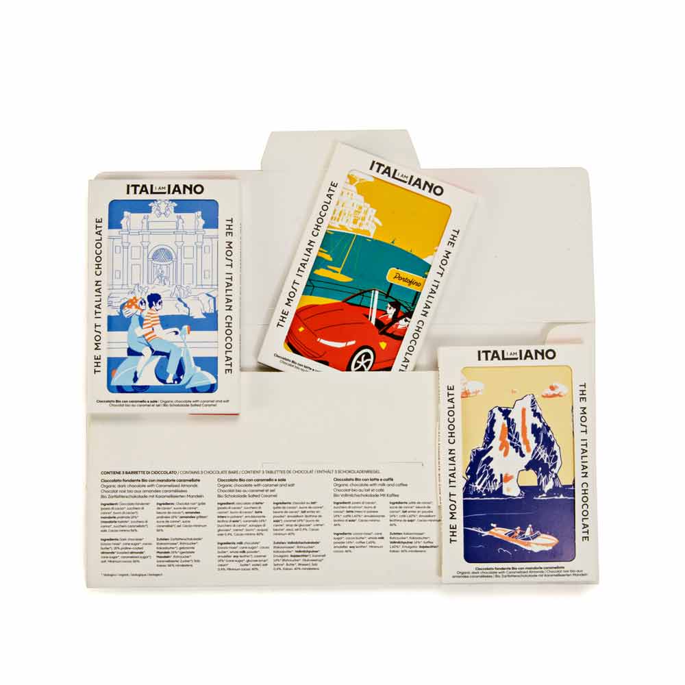 Taste the stories of Italy and revel in the iconic culture for which it’s known. Each bar serves as a tribute to the traditions, culture, and masterful artistry that comes from this small but storied land. Three unique chocolate bars, bundled together with their selection of stunning art prints that double as post cards to send and share with your loved ones. Cin cin!