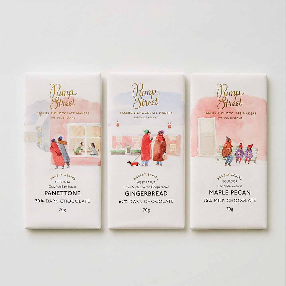 A presentation box of three Bakery Series bars made specifically to celebrate the best bakes of the festive season. The box includes: Panettone 70%, Gingerbread 62%, Maple Pecan 55%. All of the chocolate is made by Pump Street Chocolate, from bean to bar, and embellished with their own baked goods.