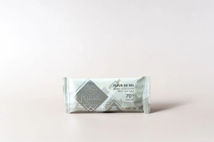 This bite-sized version features delicate French Fleur de Sel “Flower of Salt” paired with Ritual’s signature Mid Mountain 70% dark chocolate, a smooth, complex blend of cacao sourced from small farms around the world. The salt’s crisp, delicate flakes melt with each bite, heightening the chocolate’s subtle tasting notes and creating a lingering, balanced finish.