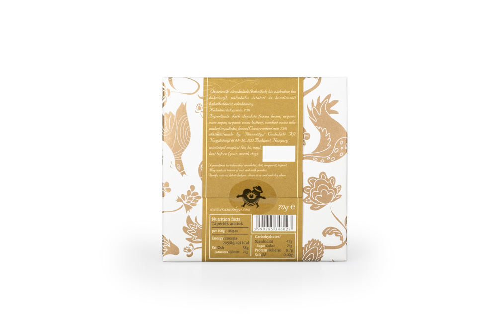 Ingredients: cocoa beans, organic cane sugar, cocoa butter, candied cocoa nibs with palinka, fennel