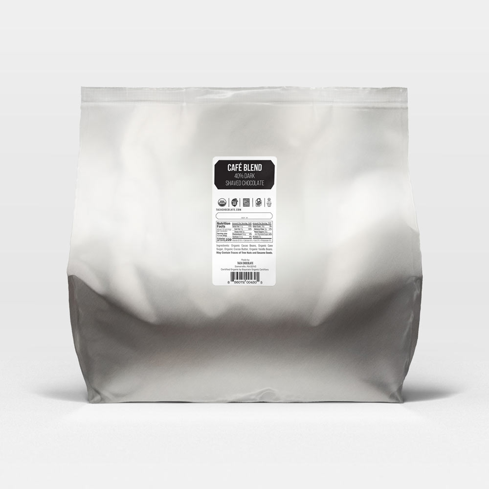 Taza’s Cafe Blend boasts 40% stone ground chocolate, shaved and sweetened, in a 3 kg bag (6.6 lb). It’s perfect for beverages, melting quickly and easily, providing the sweet but bold flavor of our Direct Trade certified cacao. Part of our Pro Line, designed for both chefs and home cooks who are serious about chocolate.