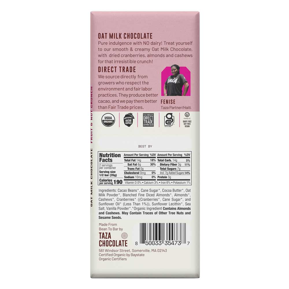 Oat Milk Chocolate is pure indulgence with NO dairy! Experience the smoothest, creamiest Taza Chocolate yet, paired with sweet-tart cranberries and crunchy almonds and cashews! Organic, vegan, dairy-free, gluten-free, Direct Trade certified, and thoroughly irresistible.