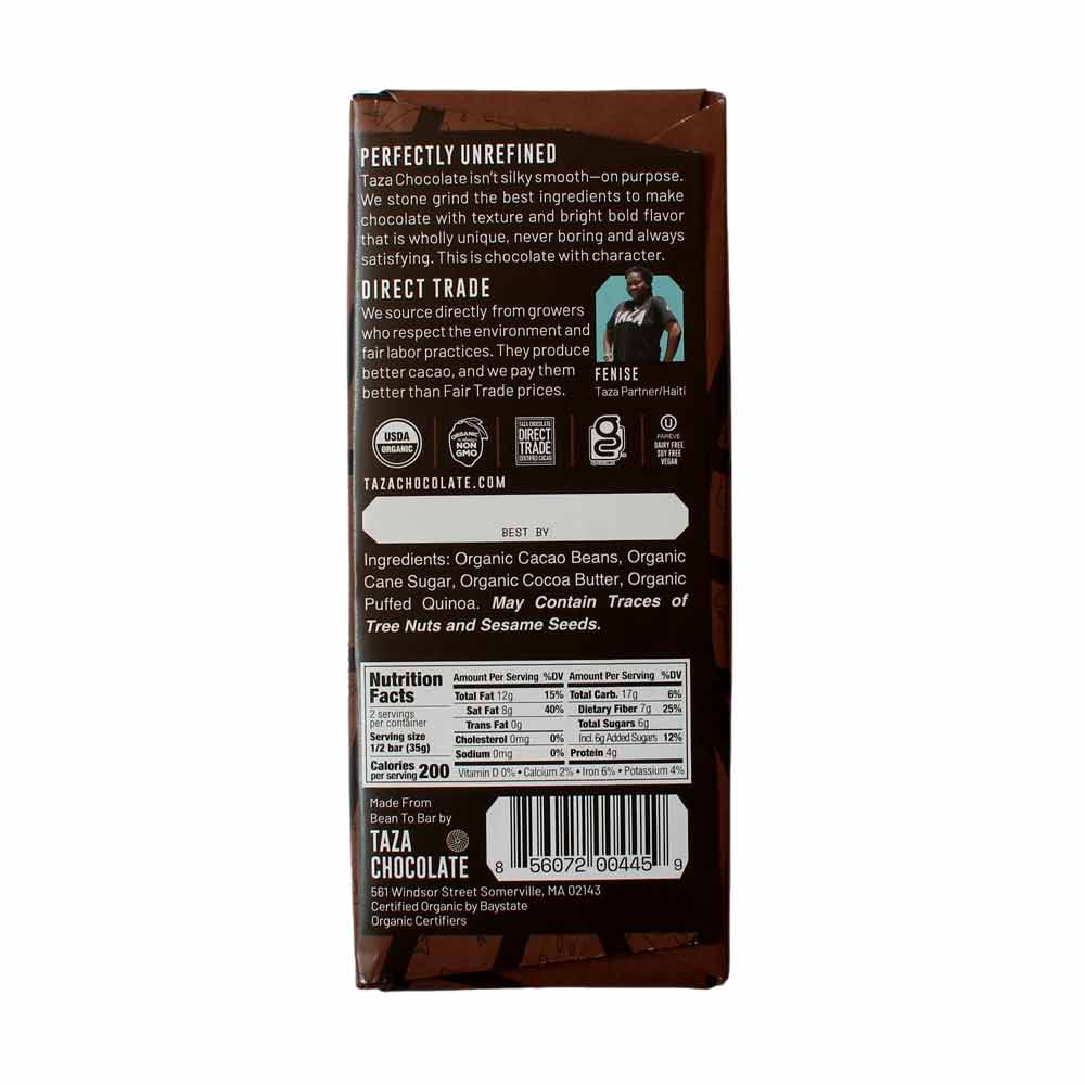 Ingredients: Organic cacao beans, organic cane sugar, organic puffed quinoa, organic cocoa butter. Contains traces of almonds, cashews, coconut, hazelnuts, and pecans.