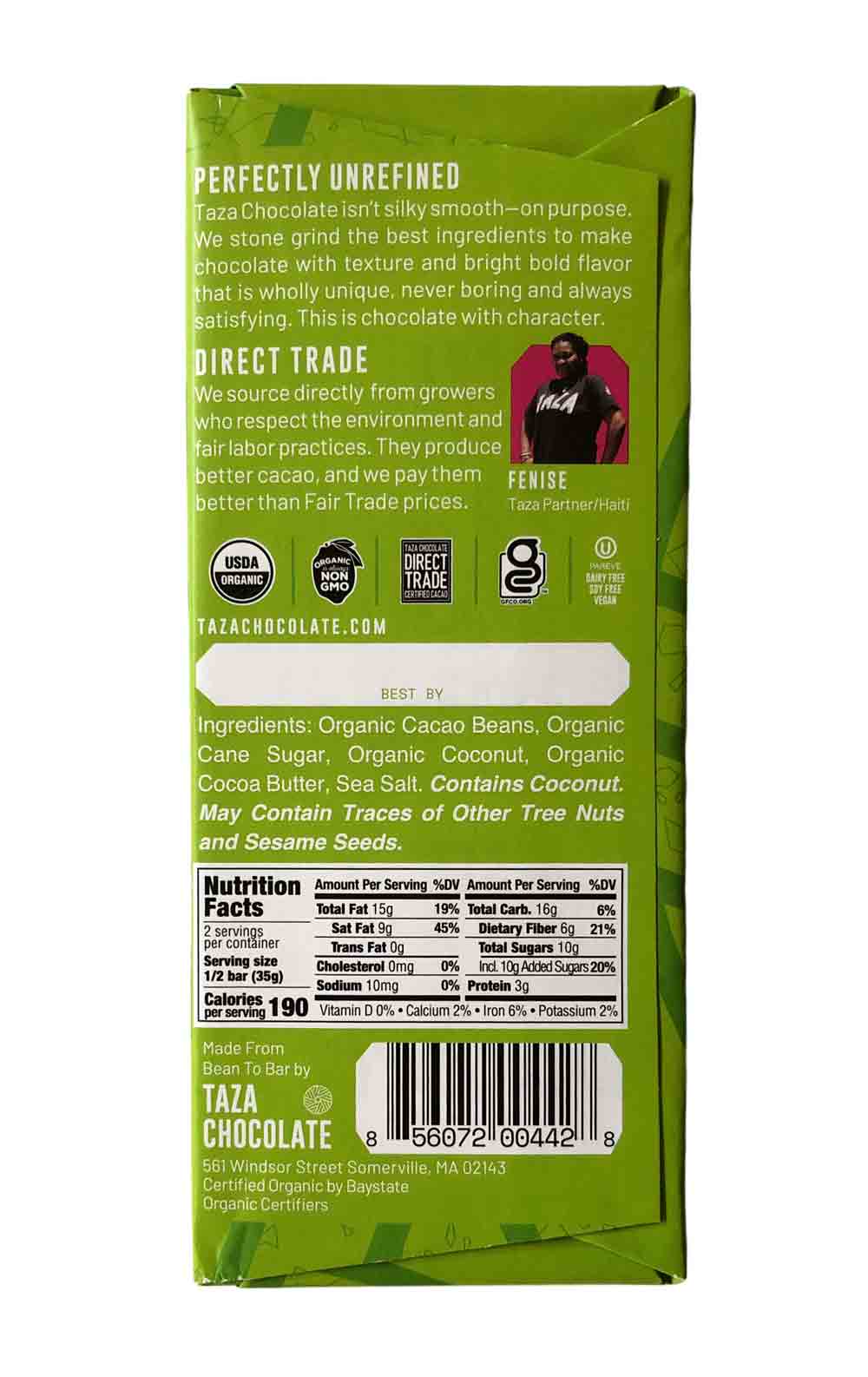 Ingredients: Organic cacao beans, organic cane sugar, organic coconut, organic cocoa butter, salt. Contains coconut and traces of almonds, cashews, hazelnuts and pecans.