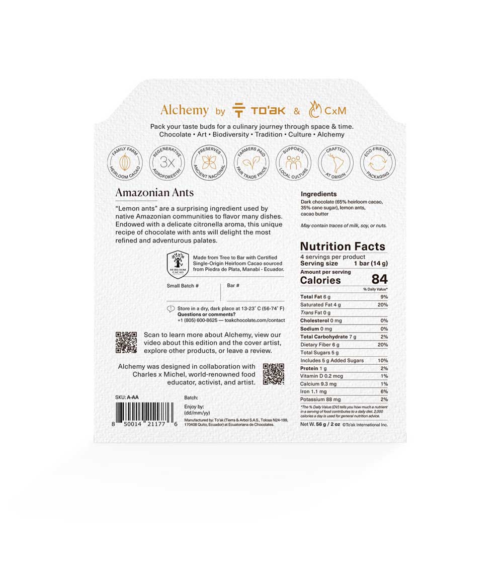 As a food source, ants are nutrient-rich and ecologically sustainable. Amazonian communities use them as a condiment in many preparations, ranging from soups to Tucupí-based sauces. Despite the abundance of protein, vitamins, and minerals that ants provide, this is an ingredient that many people in the West are unfamiliar with. Combined with chocolate they rise to the level of a gastronomic delicacy.