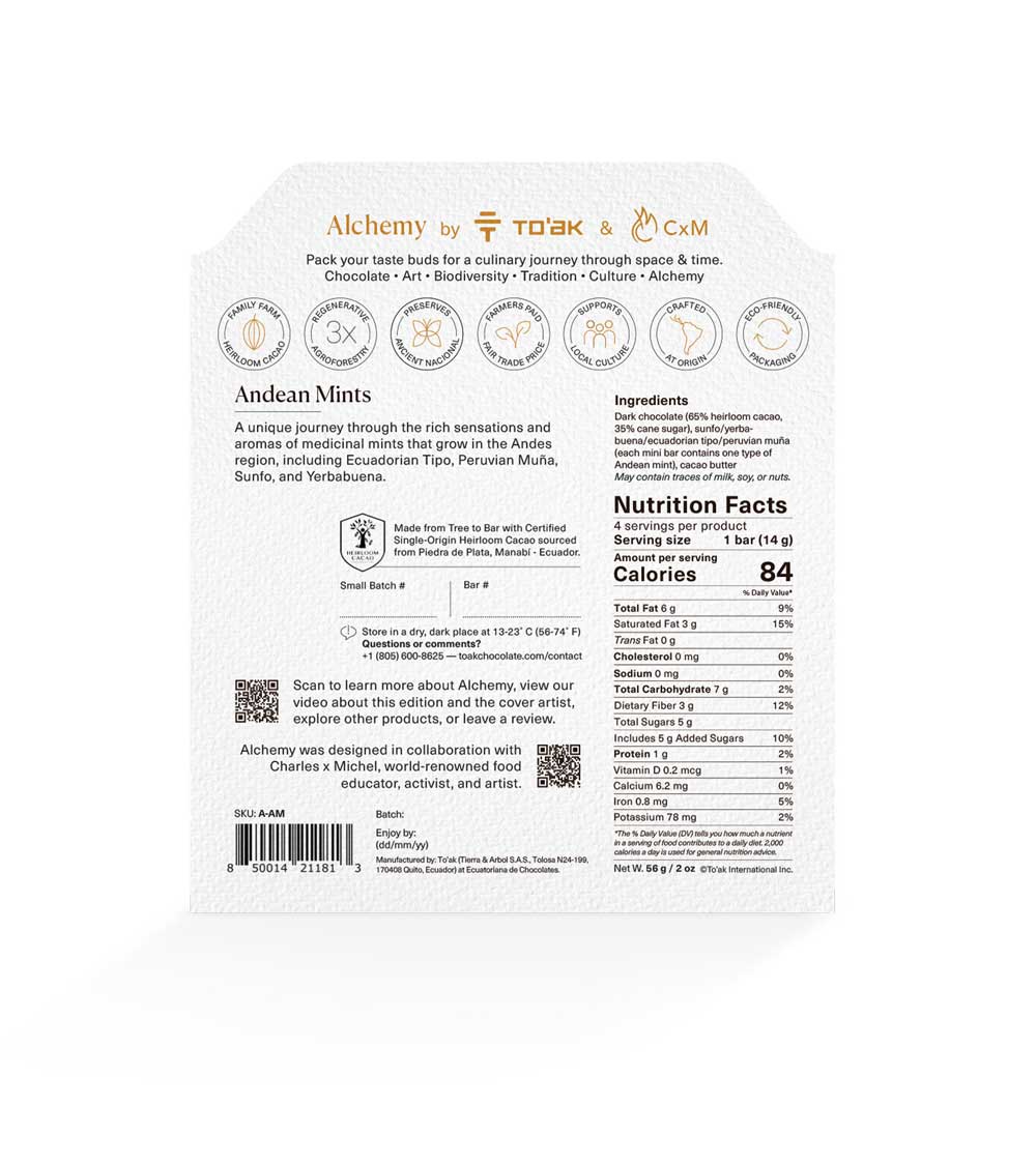 This chocolate experience brings attention to regional biodiversity. A unique journey through the rich sensations and aromas of medicinal mints that grow in the Andes, including Ecuadorian Tipo, Peruvian Muña, Sunfo, and Yerbabuena.