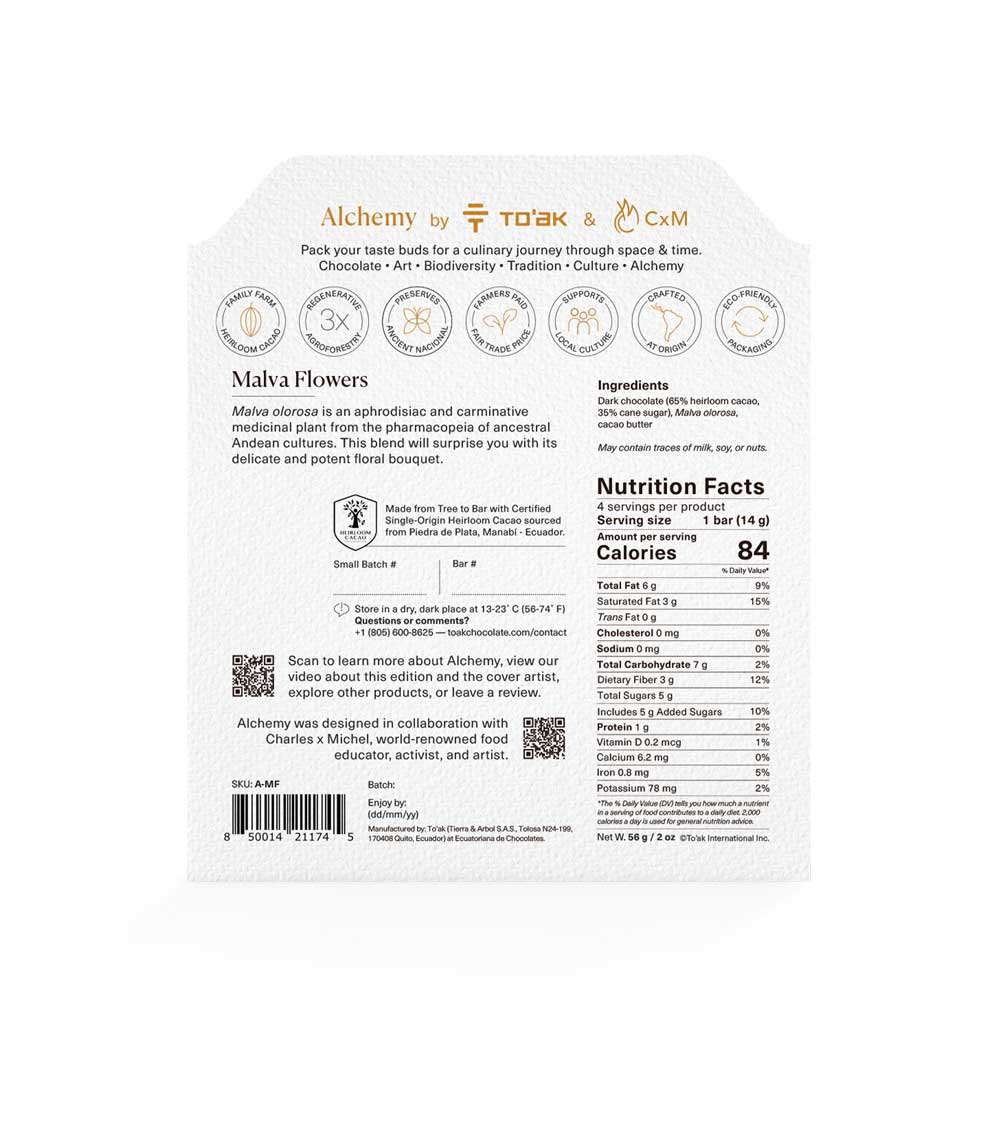 INGREDIENTS: Dark chocolate (65% heirloom cacao, 35% cane sugar), Malva olorosa, cacao butter