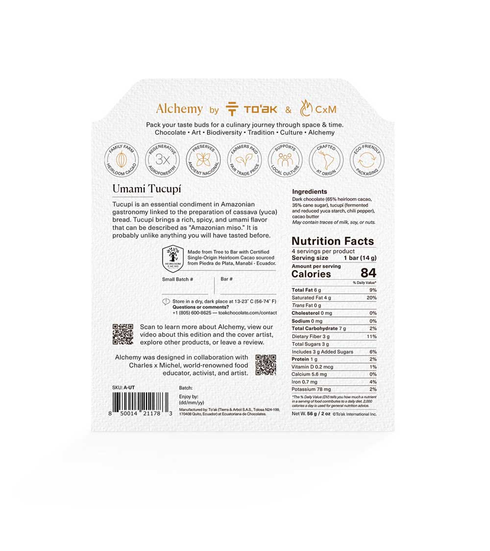 INGREDIENTS: Dark chocolate (65% heirloom cacao, 35% cane sugar), tucupí (fermented and reduced yuca starch, chili pepper), cacao butter